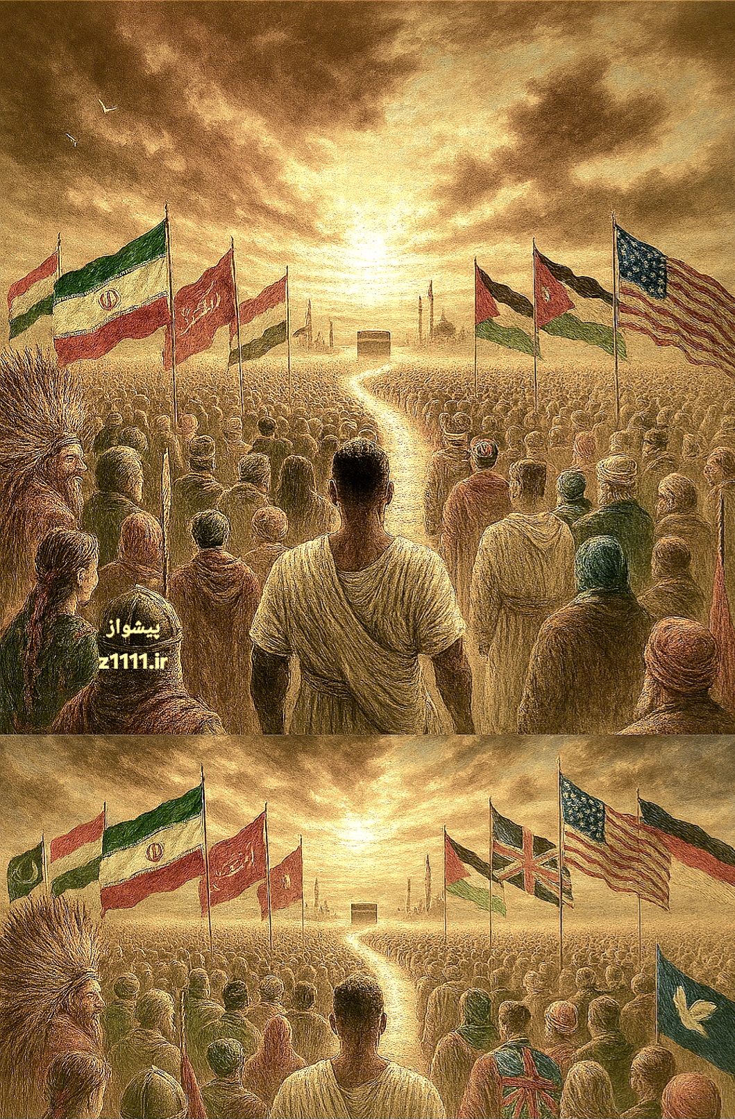 پیامبران الهی در کنار هم، برای اقامه نماز، در نقطهای واحد، در پیشگاه پروردگار. و آنگاه جهان، با پرچمهای گوناگون، از شرق و غرب، با تمام فرهنگها و قومیتها، به سوی کعبه خواهند آمد تا بیعت کنند و دوره حاکمیت ظلم، برای همیشه به پایان برسد.